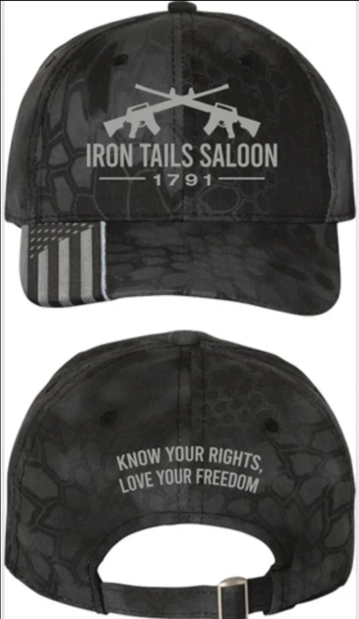 Black baseball cap featuring the logo and name of Iron Tails Saloon, 1791, with crossed rifles and a snake logo, and the message 'Know your rights, love your freedom' on the back.