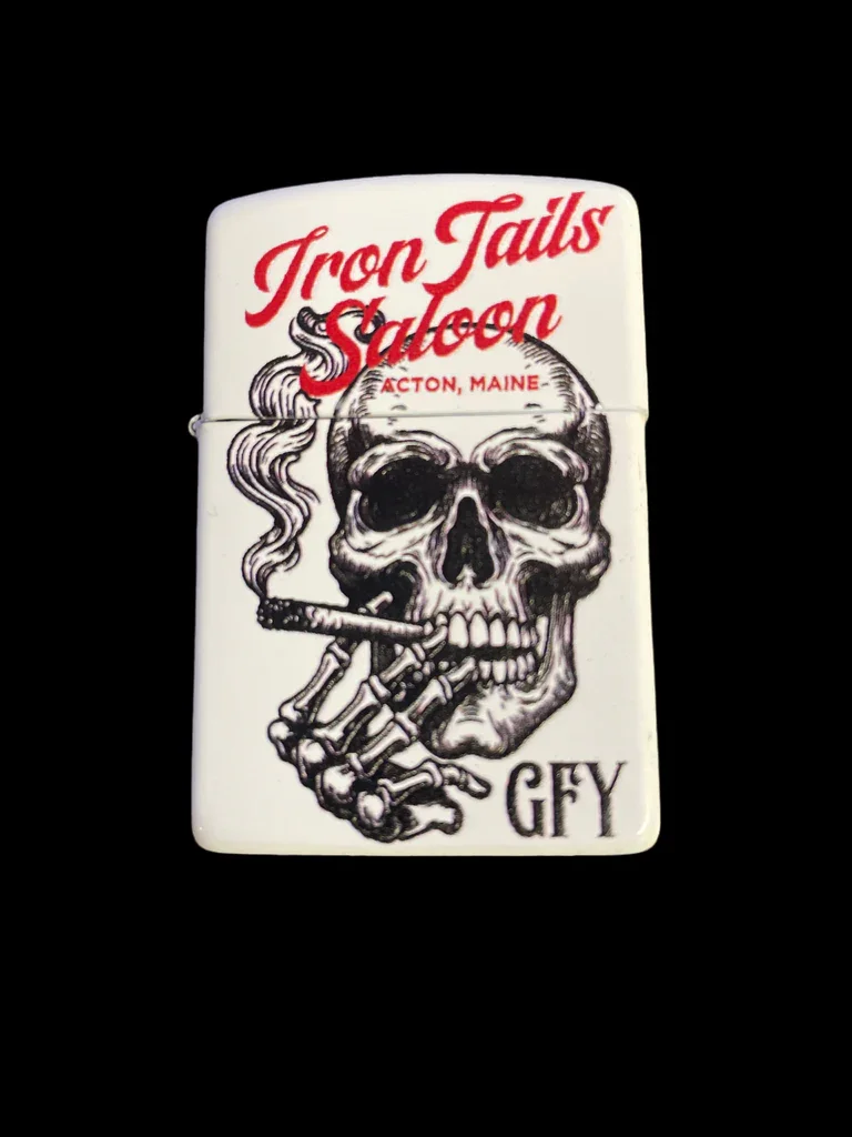 A woman wearing a bright blue hoodie with a logo reading 'Iron Tails Saloon' on the back, sitting on a motorcycle or scooter on a street with trees and cloudy sky in the background.